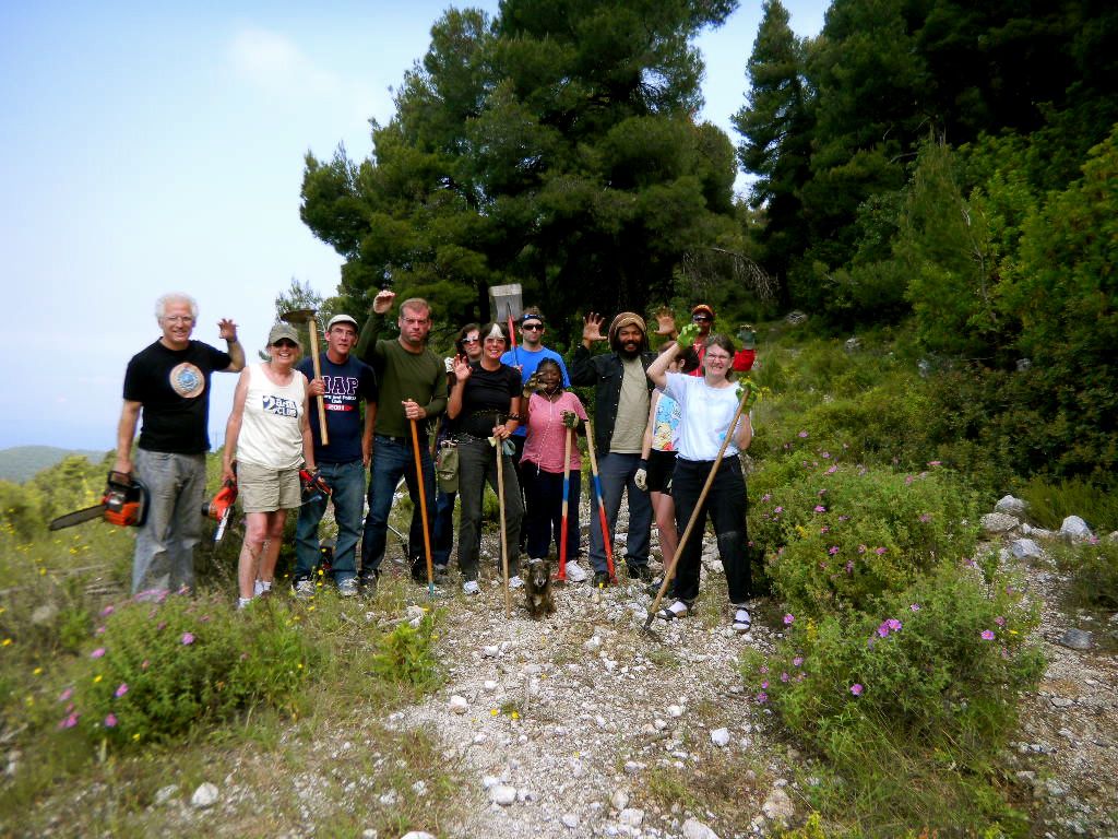 A wonderful 5 hour hike we did was as follows : Aghios Charalambos ( breathtaking views on a hilltop with shepherds’ pens ) , narrow footpath in the brushwoods , 4-way crossroad ( right arm might lead to Staphylos , who knows ?) , we took the upper arm straight to Palouki top antennas ( the goat-paths became quite faint , it was more guessing and cross-country , actually ), Palouki ridge dirt road ( on the way , at the start of the walk to Aghia Anna or to Taxiarchis , we also saw these amazing stone pavings … At the little round clearing there, we saw your orange footprint way-marking on a tree , pointing to the direction of the sea , more or less toward Alonissos : do you have a walk there ? ).At that saddle with a water tank and a sort of goat-pen made of steel grilles , we took the tiny footpath marked by your footprint going down a gulley in the oak-woods ( by the way at that “saddle” we also saw these new impressive stone kalderimia into 2 directions : we’ll try them next time ).Down on the asphalt road above Metamorphossi Sotirou , we then took at the bend the dirt road and then footpath to Aghia Marina ( time to refill ! ) and the small road down to the valley .