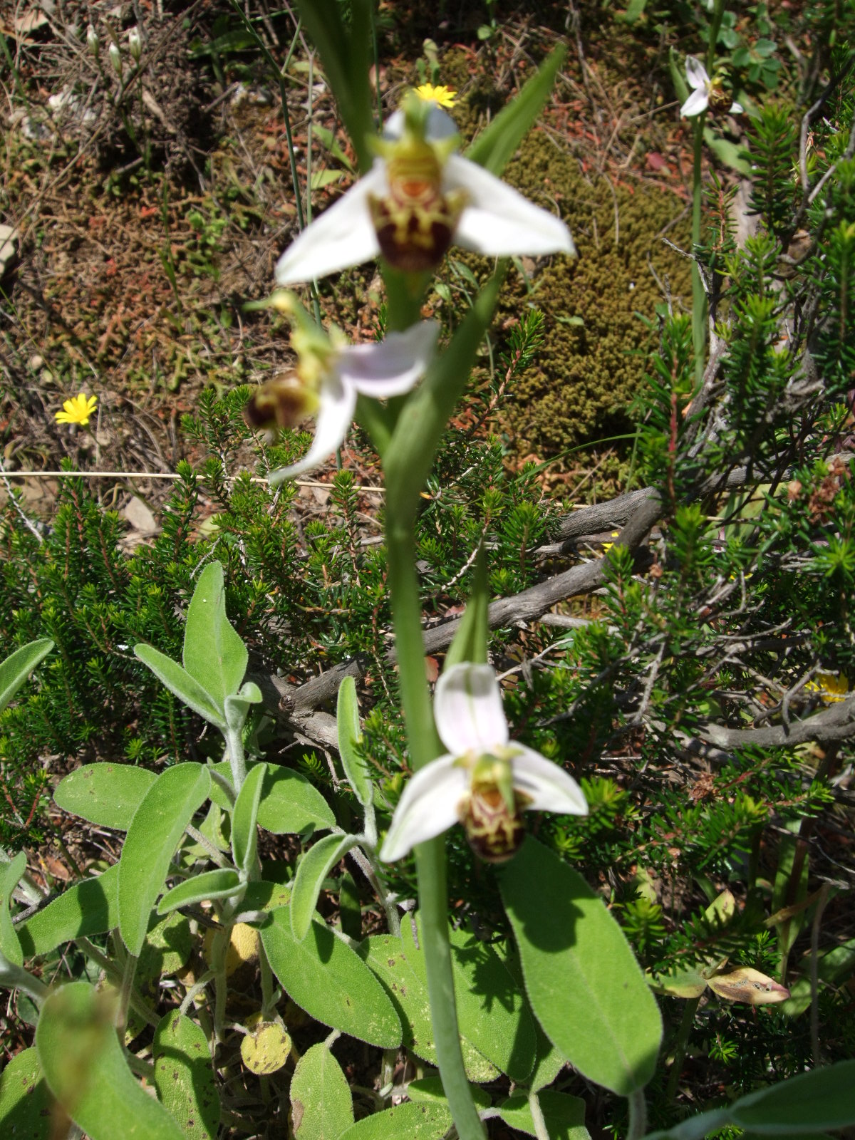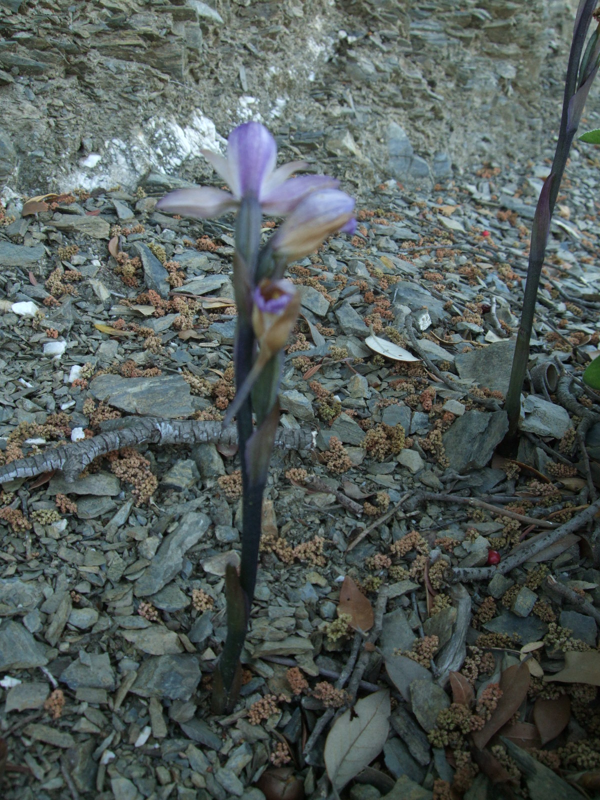 On Sunday I took a very long investigative hike on Palouki hill. I found the old way through to Palouki (via the goat station and The Cross). All very overgrown and I’m glad I took it out of this edition of the book. If it.were cleared, one could walk practically all the way there by track. I was also trying to find a way through to Mili from the end of the Lower Mast Road. After 3 attempts, gave up… this time. What I did find (after a tip off) however was a couple of Violet Bird’s Nest Orchids, in the strangest place, just beside the road.